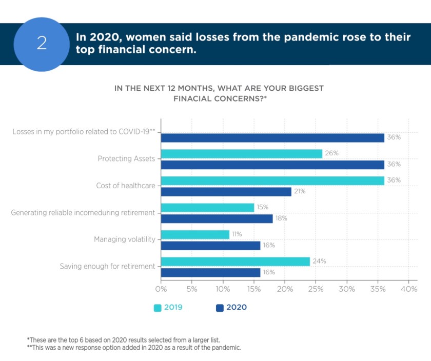 A study by Nationwide found that among 297 women with investable assets of $100,000 or more, 72% believe the pandemic had a negative impact on their retirement savings. Additionally, women listed losses from the pandemic as their top financial concern last year. Other worries involved protecting assets, health care costs and longevity risk during retirement. https://www.plansponsor.com/womens-retirement-savings-especially-affected-pandemic/