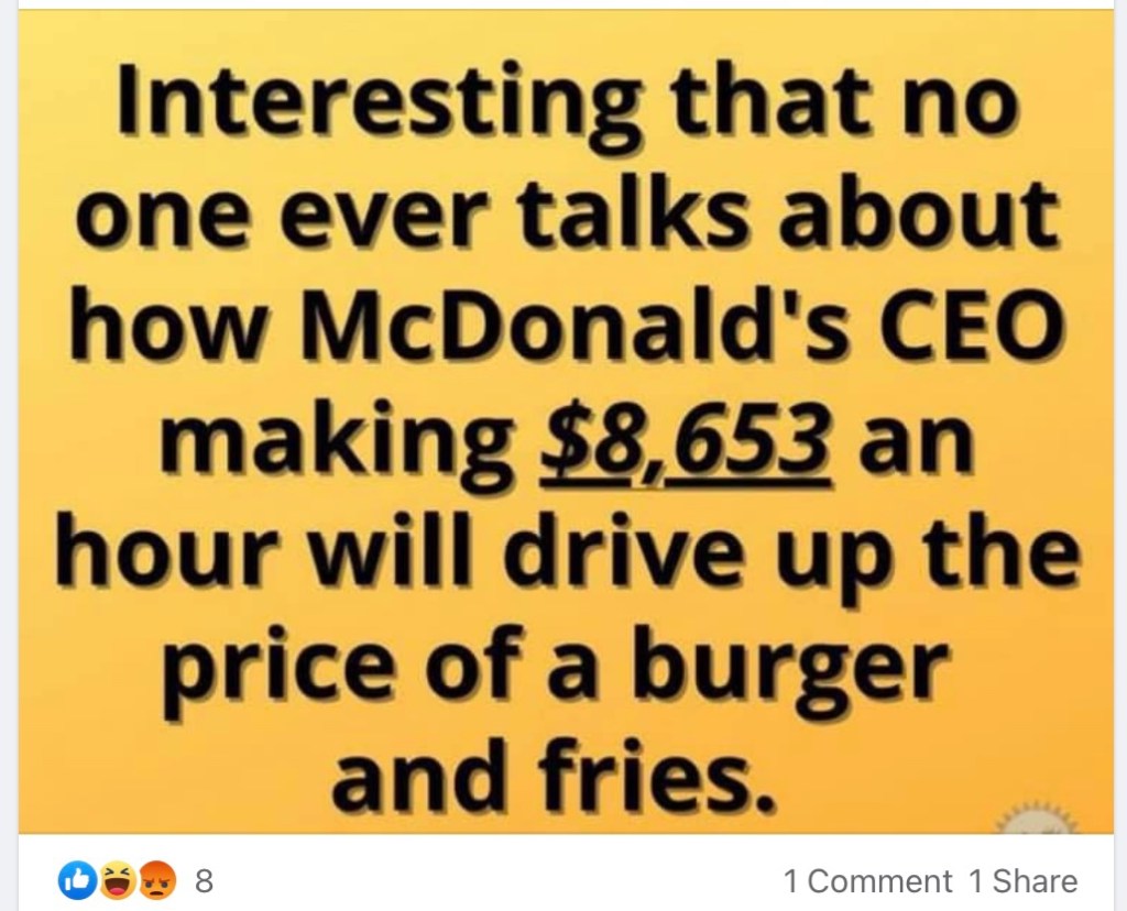 This one uses several Common Fallacies, don’t you love it? Many people do and they accept and support the idea that there is a connection between CEO compensation and worker hourly pay. The math doesn’t even make sense. Not only that but the generic use of CEO creates a false narrative as well.