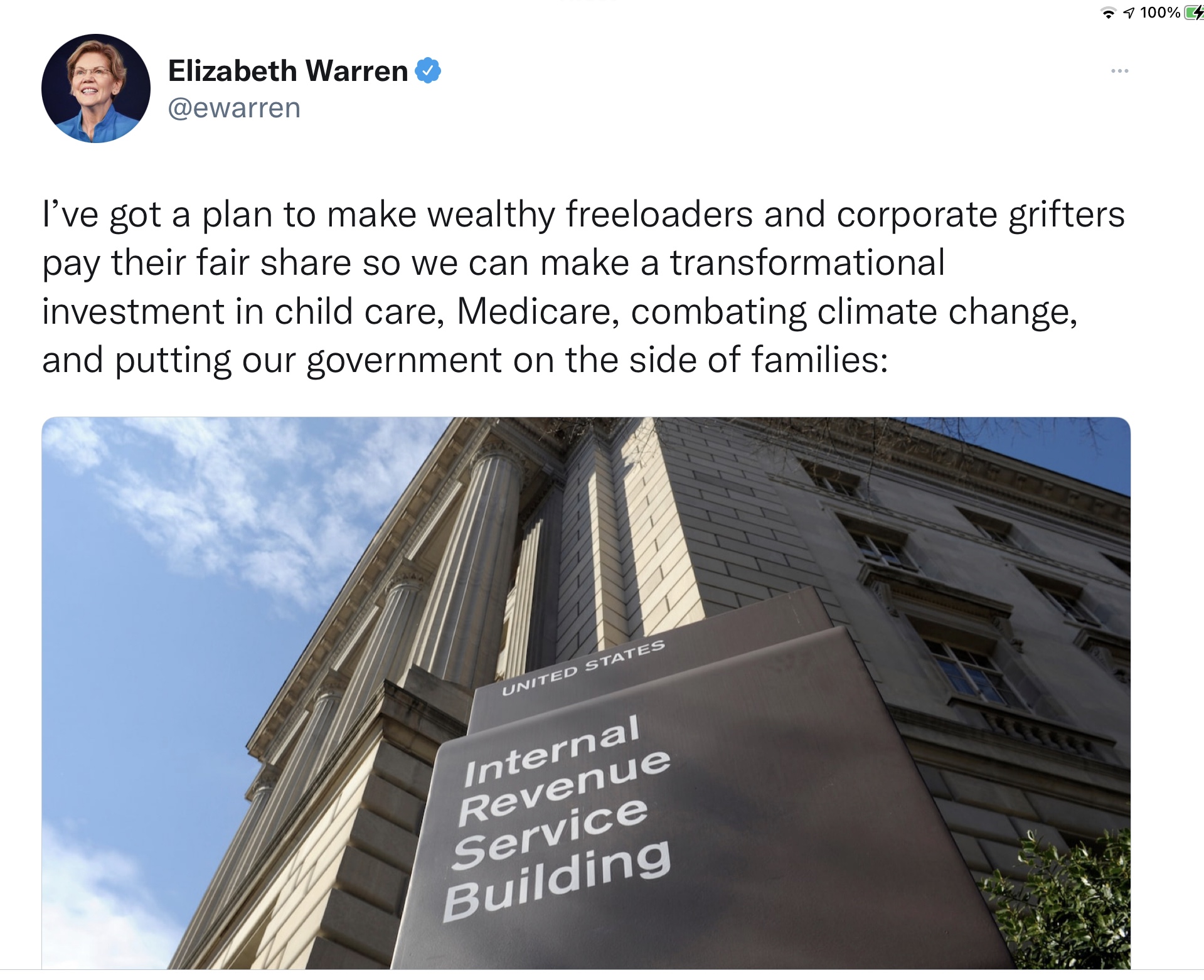 Elizabeth Warren wants to grab more money to spend money and create more ongoing, rising cost, programs. I could buy into higher taxes if they were used to lower our deficit and debt and more importantly assure we can pay for and keep sustainable the obligations we already have … like Medicare, Social Security, Medicaid and the transportation trust fund.