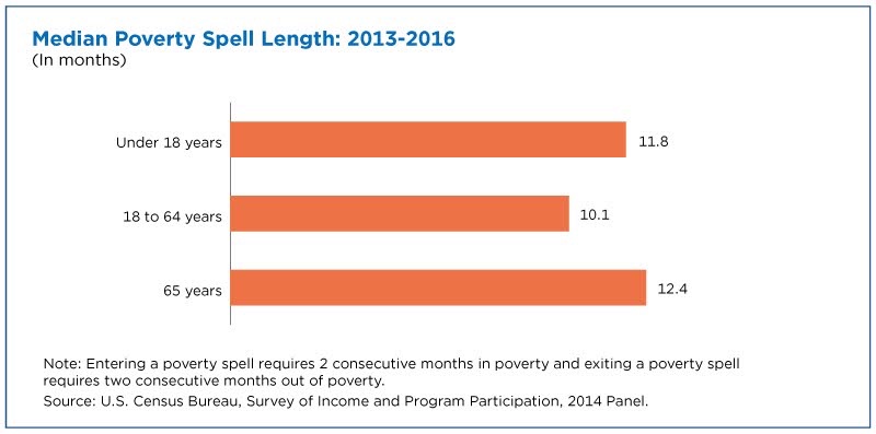 Chronic Poverty Across age groups, shorter poverty spells were much more common than multi-year poverty spells between 2013 and 2016. Chronic poverty describes individuals in poverty for all months of the 2013-2016 period studied.