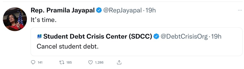 If the idiots have their way and waive the debt, the debt doesn’t go away, it gets added onto the $30+T. And, if those who benefitted from college education shouldn’t pay, you think those who didn’t go to college should pay, or those who went to college and worked their way through, how about those who took lower wages in the military or at an employer who offered an educational assistance plan, or those whose parents paid?