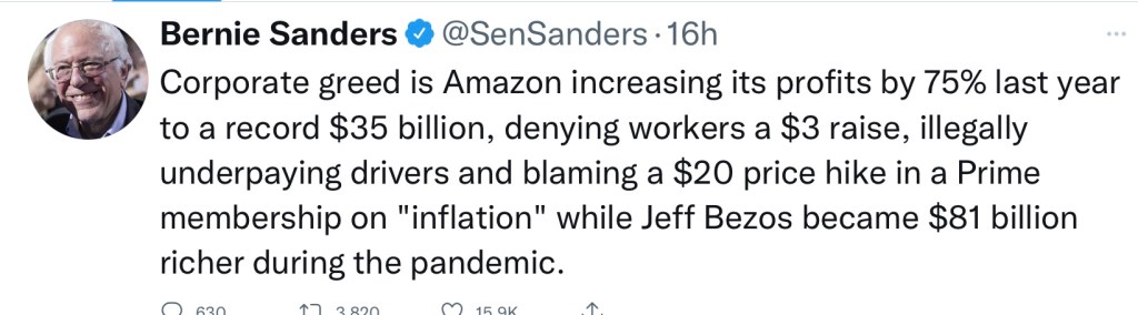 Sen Sanders Tweeted the following. Needless to say Bezo’s wealth has nothing to do with Amazon pay practices. Regardless, this inflammatory pandering gets results. Greed is a trigger word.