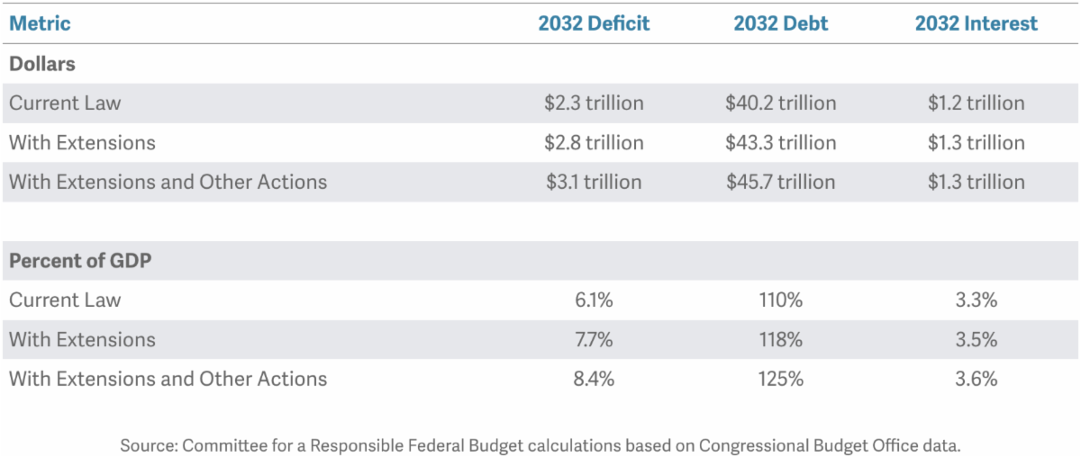 Though it is unclear exactly how much many of these provisions will cost, a reasonable set of assumptions suggests they could add an additional $2.4 trillion to budget deficits through FY 2032 for a total of $5.5 trillion of costs above current law. This would cause debt to reach a record 125 percent of GDP by 2032.