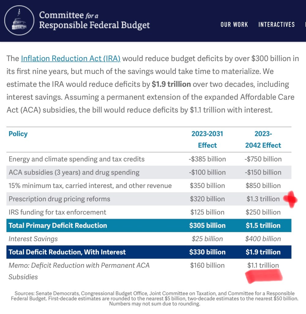 I also think it’s safe to assume the enhanced ACA subsidies will not go away in three years so the realistic reduction in the deficit over twenty years is $1.1 trillion or the equivalent of $55 billion per year, roughly a 4% annual reduction.
