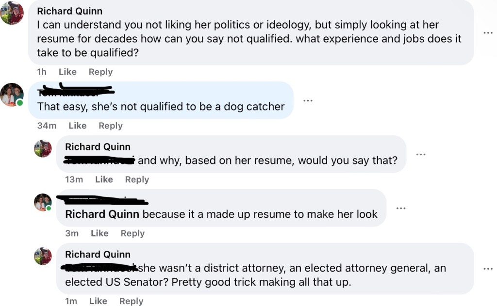 The following is a FB exchange on November 5 related to a post that Harris was not qualified to be president.