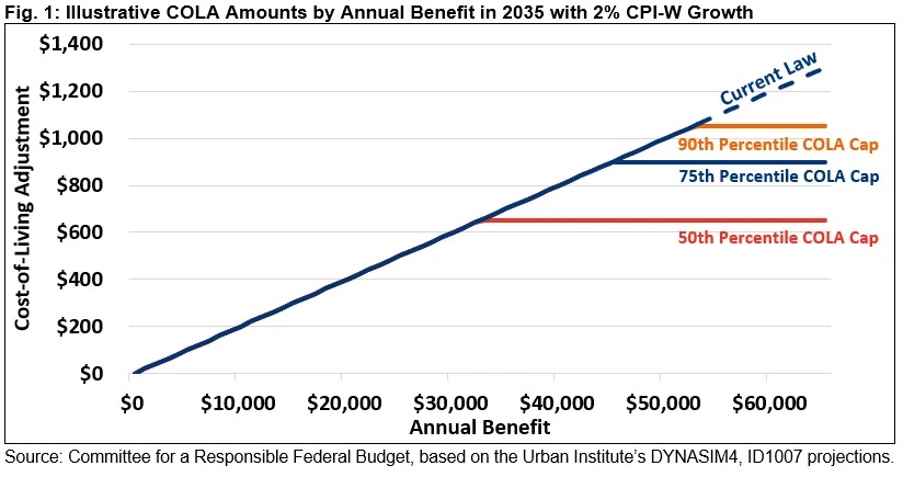 For example, if CPI-W growth in 2035 were 2 percent and the cap was set at $900, a retiree with a $50,000 benefit who would receive a $1,000 COLA under current law would instead receive $900. Those with $45,000 or less in benefits would receive the same COLA as under current law.