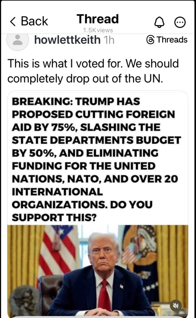Some of the things mentioned are not so far fetched. The UN has been heavily funded by the US over the years and it hasn’t delivered what was envisioned when it was formed. The big dogs still do what they will in the world. NATO was formed to counter the Soviet Block. The Soviet Union has been gone for years. The US carried much of the load of supporting it and expected approval of the members for actions in the Mideast for example which was outside its mission in my opinion. So let it go.